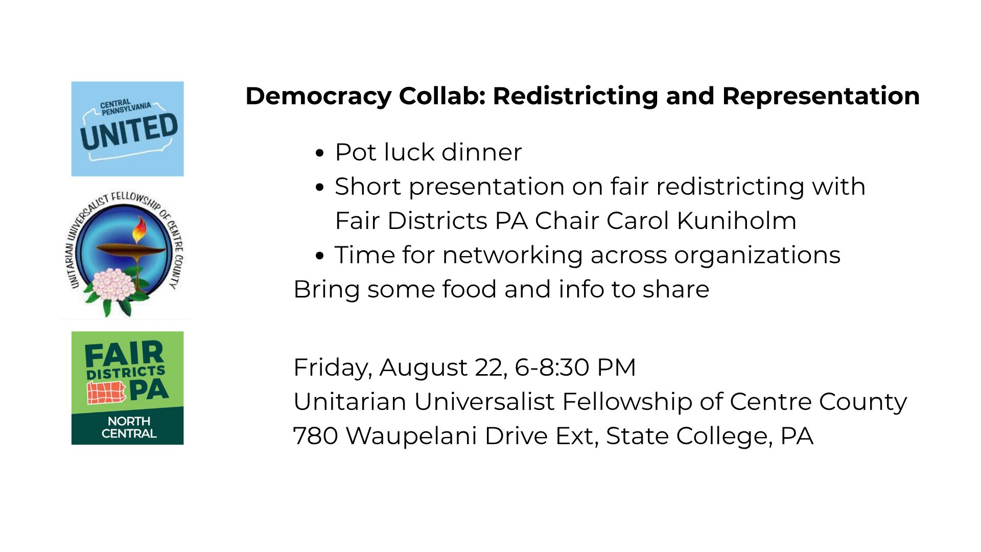 Join Fair Districts PA, Central Pennsylvania United and the Unitarian Universalist Fellowship of Centre County for: