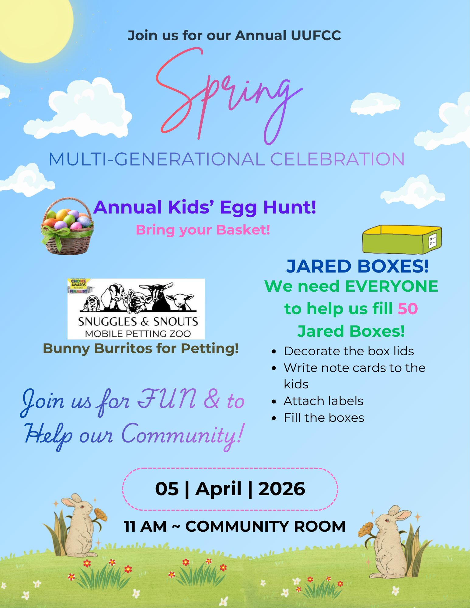 Celebrate the season at our Spring Multi-generational Celebration featuring our annual kids’ egg hunt and the opportunity to pet "bunny burritos." You are invited to bring your basket and help us reach our goal of filling 50 Jared Boxes for children in our community. We look forward to seeing you there for a morning of fun and service.