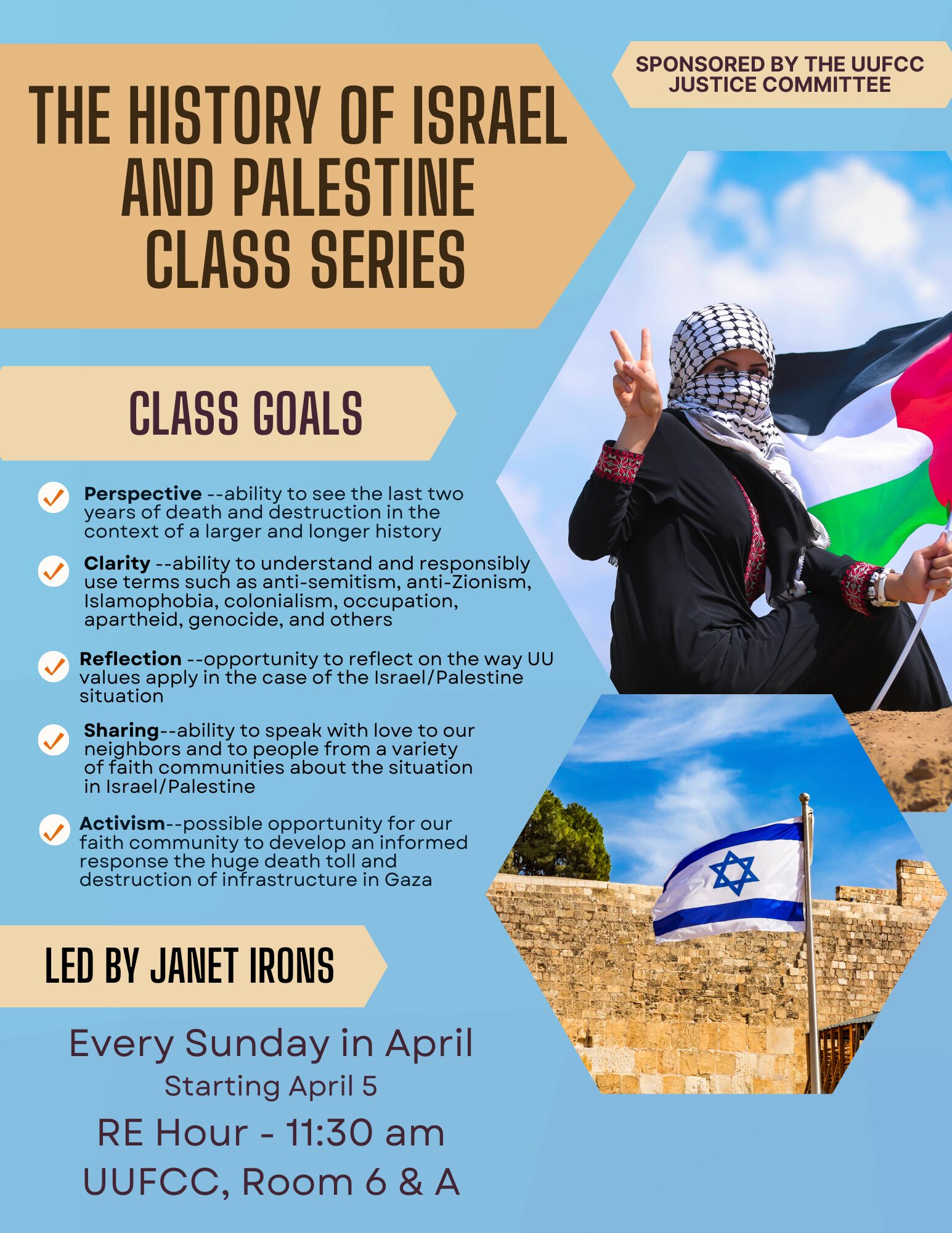 Sponsored by the Justice Committee & led by Janet Irons every Sunday in April. Join us for a discussion class exploring the history of Israel and Palestine in a safe space dedicated to providing you with deeper understanding and conversation. Utilizing resources from the UUA and Unitarian Universalists for Justice in the Middle East, we will guide you through historical contexts and terminology while highlighting local efforts to elevate the understanding of this crisis in our own community. Through sharing and reflection, we will discover meaningful activism opportunities and paths for action to support justice and peace both locally and beyond.